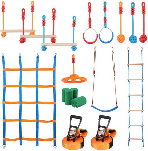 Sorbus Ninja Warrior Obstacle Course Line For Kids Training Gym 50 ft Slackline Monkey Bar Ladder, Outdoor - Backyard Recreation Playset With Bars, Fists, Gymnastics Rings, Carry Bag