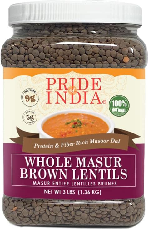 Pride Of India - Indian Whole Brown Crimson Masur Lentils - Protein & Fiber Rich Masoor Whole, 3.0 Pound Jar