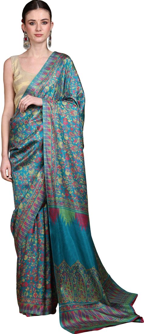 Exotic India Women's Kani Art Silk Saree With Printed Multicolor Floral Paisley Vines | Beautiful Sari With Blouse Piece