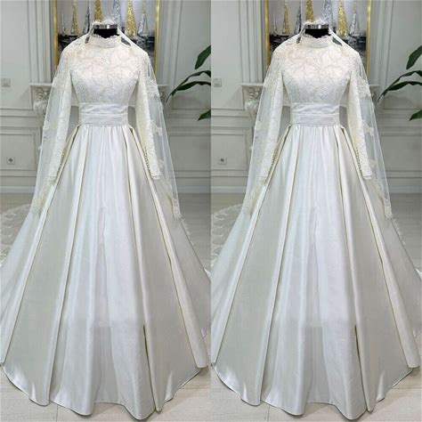 Muslim Wedding Dresses Long Sleeves High Neck Lace A Line Satin Bridal