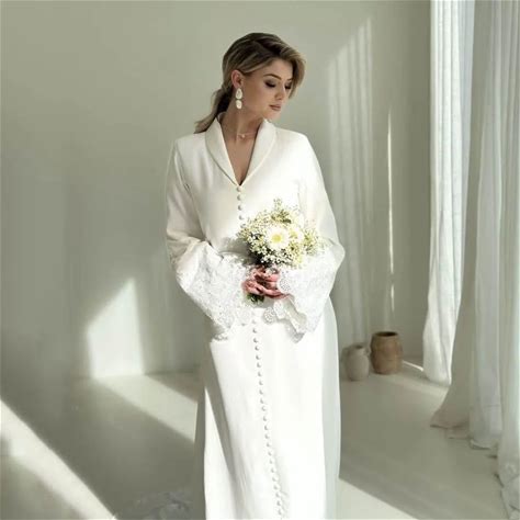 Muslim Wedding Dresses A Line Modest Brides Dress O Neck Lace Long Sleeve Button Woman's Bridal