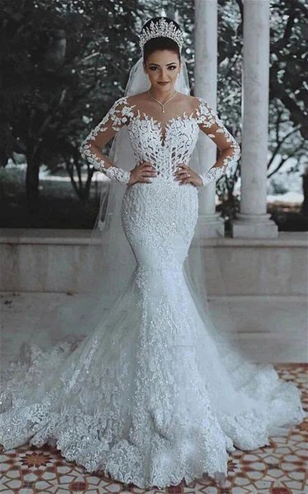 Modest Illusion Muslim Long Sleeve Mermaid Luxury Lace Wedding Dress With Court Train - White, Size 10 By Dorris Wedding