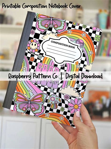 Printable Composition Notebook Cover PNG, Good Vibes Composition Book PNG, Cute Retro Rainbow Notebook Sticker, Custom Notebook Girly Design