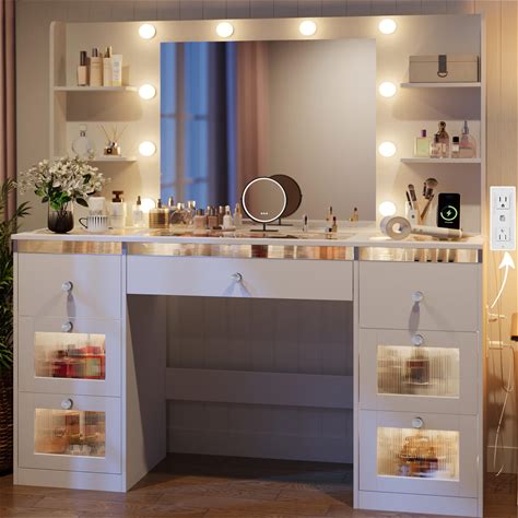 Yegosh Vanity Desk With Mirror And Lights Dimmable LED Makeup Vanity Table With Drawers Side Cabinet 3 Storage Shelves Power Outlet Dressing Table Set