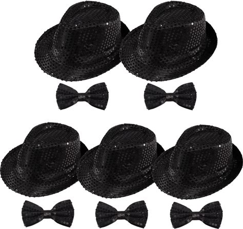 10 Pcs Unisex Sequin Fedora Hat Sequin Bow Ties Set Bling Retro Dance Jazz Cap Funky Party Costume Fedora 5Pack Black Large