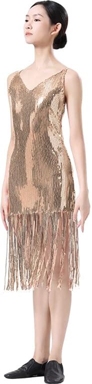 Women Sequin Tassel Flapper Dress Sleeveless Stand Collar Sparkly Fringe Latin Dresses Salsa Cha-Cha Jazz Dance Costumes
