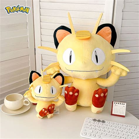 Kawaii Pokemon Team Rocket Anime Hobby Meowth Cartoon Plush Doll Girl Holding Pillow On Bed Birthday