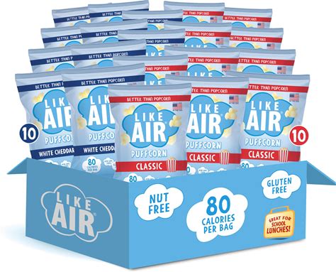 Like Air Puffcorn 2 Flavor Variety Pack (Pack Of 20) White Cheddar And Classic Puff Corn, Snack Box, 50 Calories Per Cup, Gluten Free Snacks For Kids,