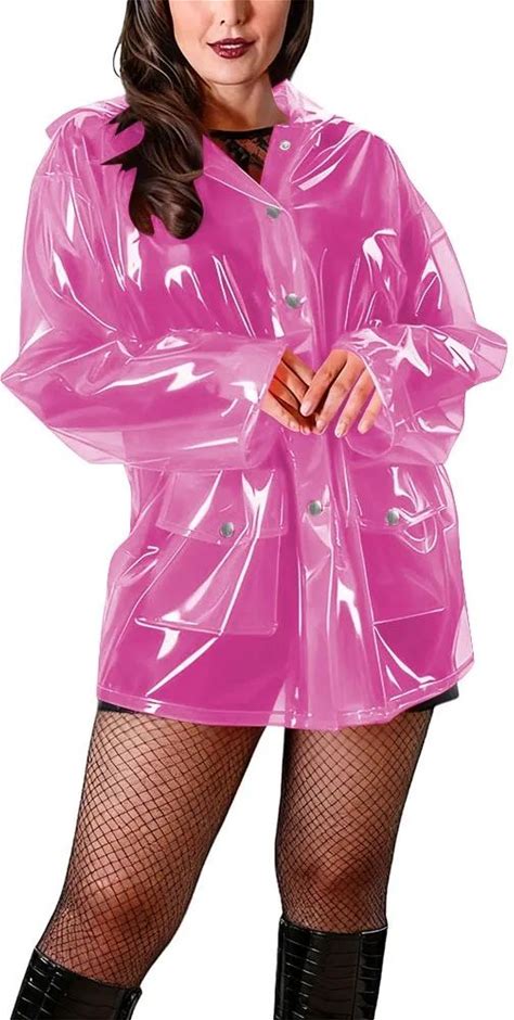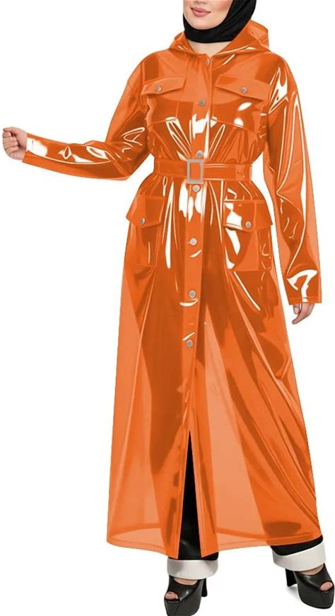 Transparent PVC Plastic Long Trench Coat For Womens Long Sleeves Hooded See Through Rocket Coat Tops