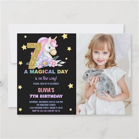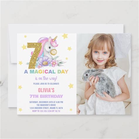 7th Floral Unicorn Birthday Invitations With Photo